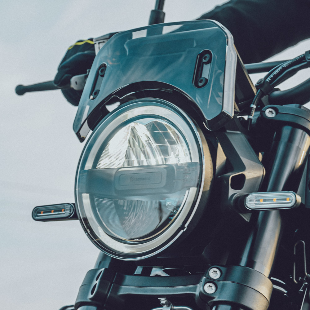 Integrated front and rear LED lights and turn signals add to the progressive and minimalist design of the Svartpilen 801. Positioned neatly around the headlight, the unique LED ring offers clear visibility in all conditions to make riding safer for the rider and other road users.