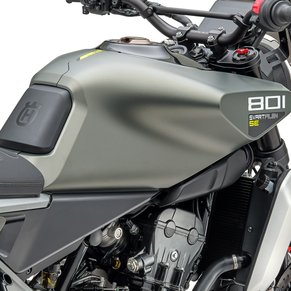 The 14-litre fuel tank is housed inside a beautifully contoured cover, which is shaped to provide extensive knee contact at all times for a confidence inspiring ride. A bronze-anodised aluminium fuel cap is complete with a machined Husqvarna logo for a premium look.